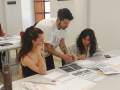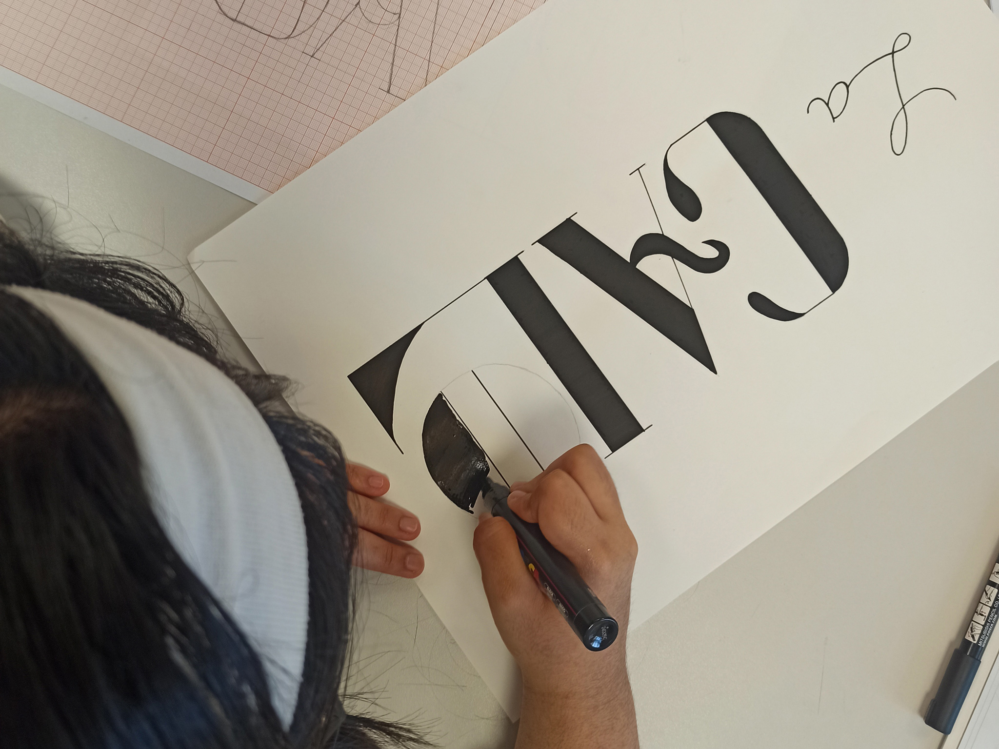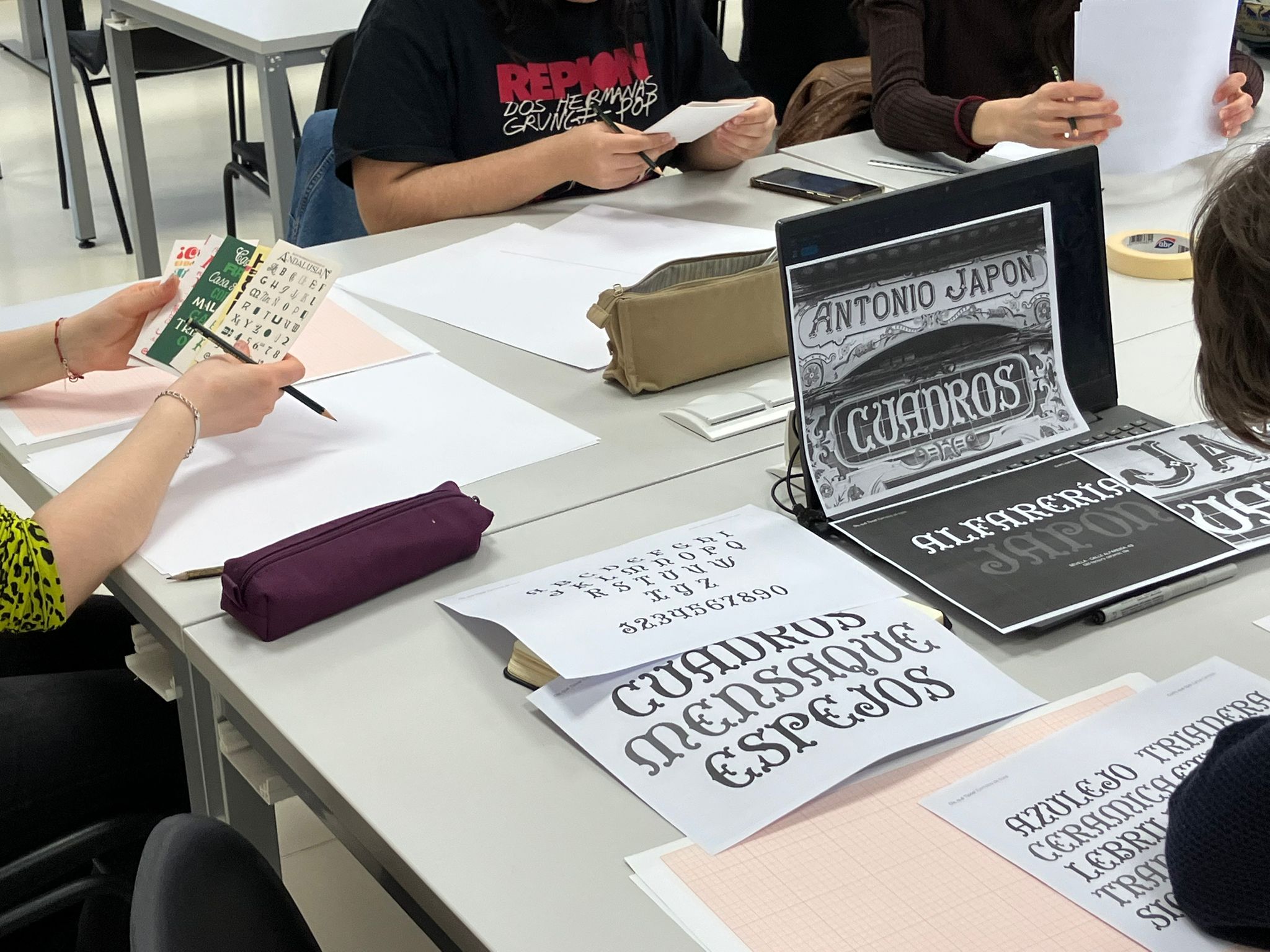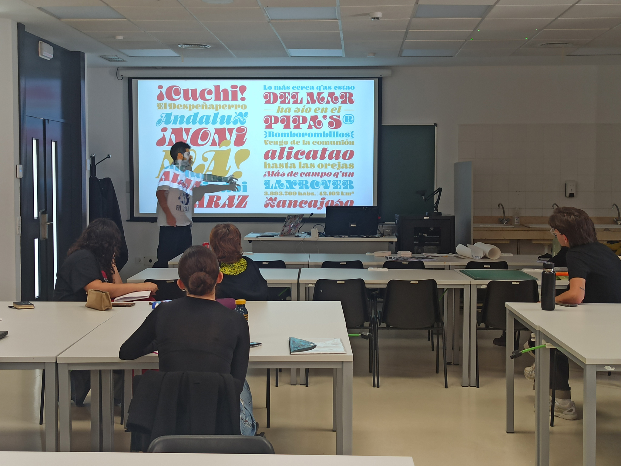La jornada comenzó en horario de mañana con la intervención de Carlos Campos (Cuchi, ¡qué tipo!), quien presentó su trabajo en el ámbito del diseño tipográfico y compartió con el estudiantado los principales hitos de su producción, estrechamente vinculada a la idiosincrasia de Andalucía y a sus rasgos gráficos más distintivos. A continuación, los participantes diseñaron una palabra característica de cada provincia andaluza a partir de las letras de un azulejo emblemático de dicha región. El resultado fue un conjunto de láminas rotuladas con un fuerte carácter expresivo y gran riqueza formal.