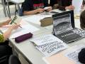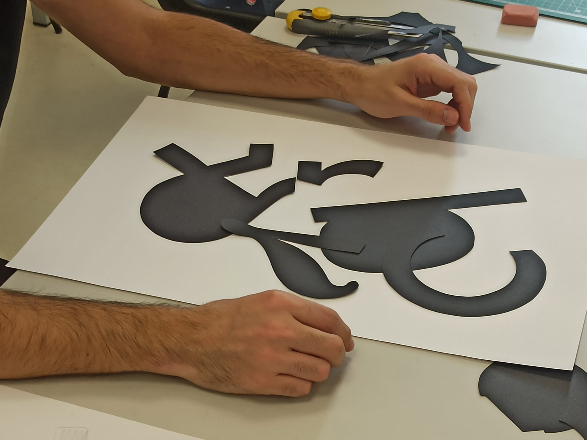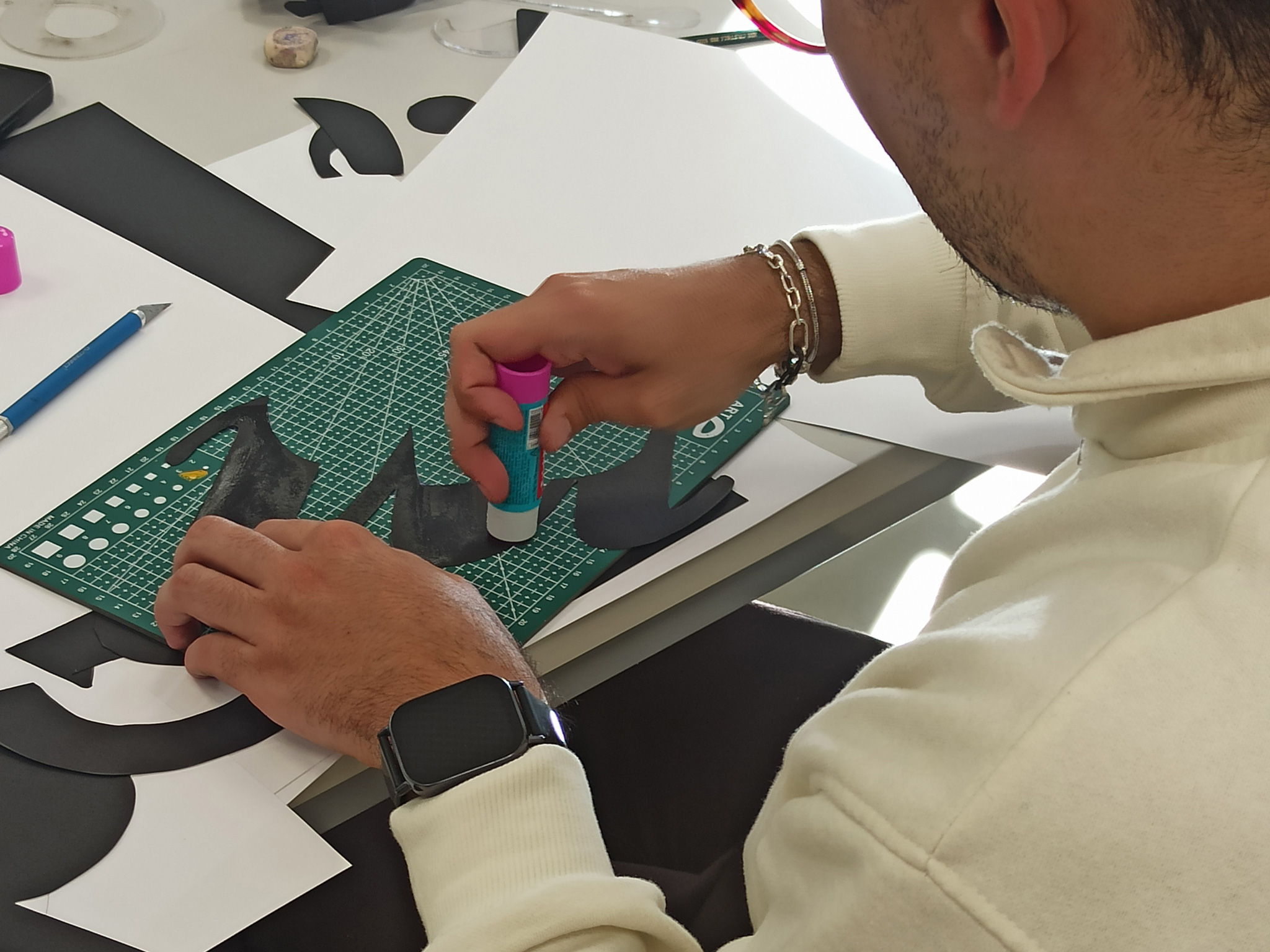 Durante la tarde tuvo lugar el taller de collage tipográfico, dirigido por el profesorado organizador de las jornadas, en el que se propuso al estudiantado la creación de composiciones abstractas mediante la combinación equilibrada de fragmentos de letras de procedencia diversa. A partir de las plantillas facilitadas, el taller permitió profundizar en la dimensión formal de la letra, más allá de su contenido lingüístico, dando lugar a una serie de láminas en blanco y negro que pusieron de manifiesto la relevancia de las conexiones formales y la importancia del equilibrio entre el espacio vacío y el espacio ocupado en el diseño de formas tipográficas.