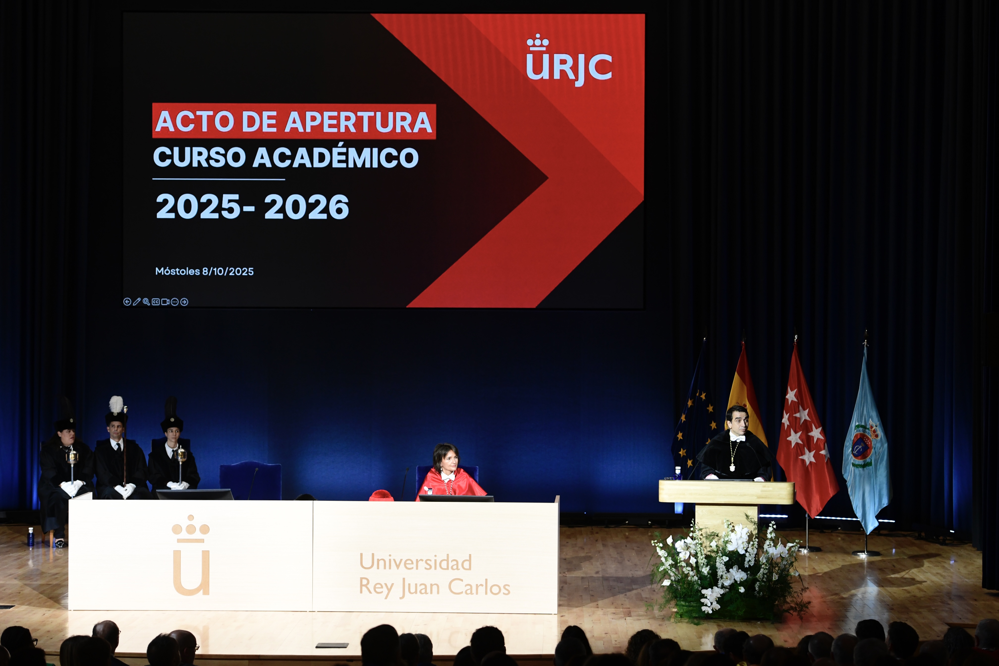 Ante un salón de actos del Edificio Rectorado repleto de asistentes, el rector, Abraham Duarte, ha inaugurado el curso académico 25/26 en la Universidad Rey Juan Carlos, reivindicando el papel de la URJC como motor de transformación.