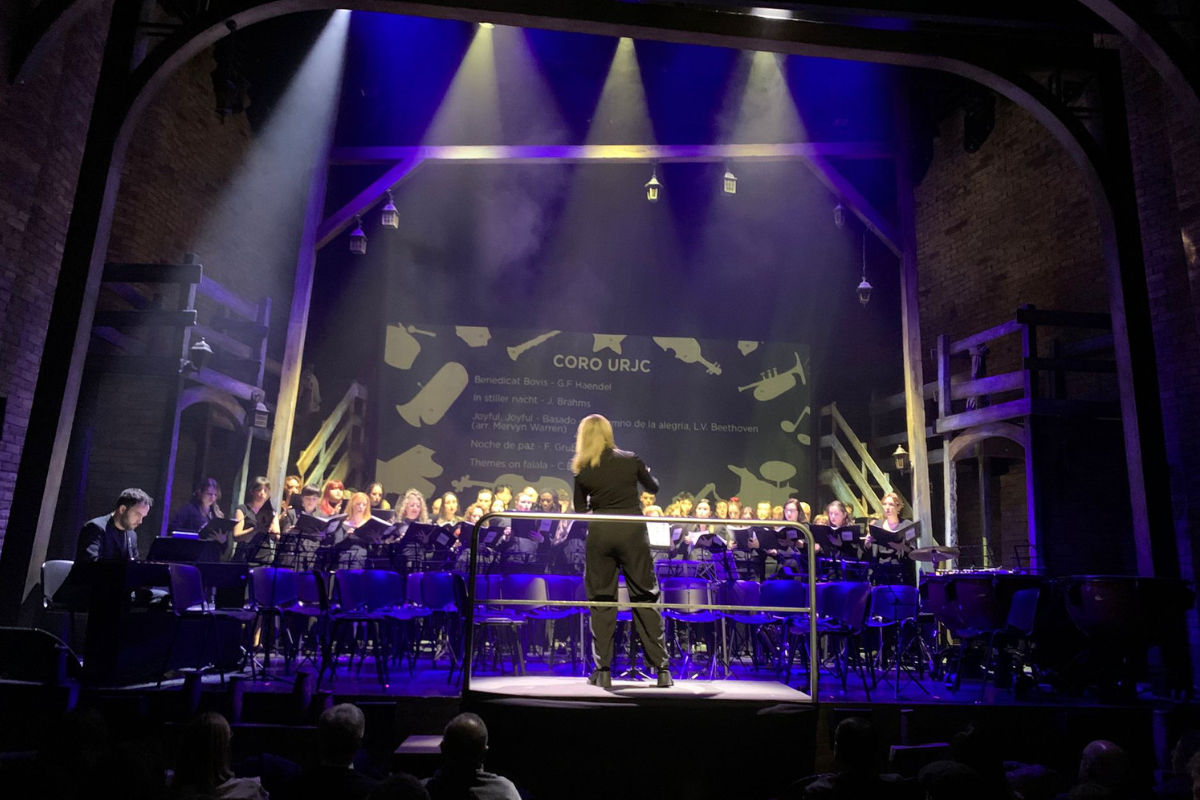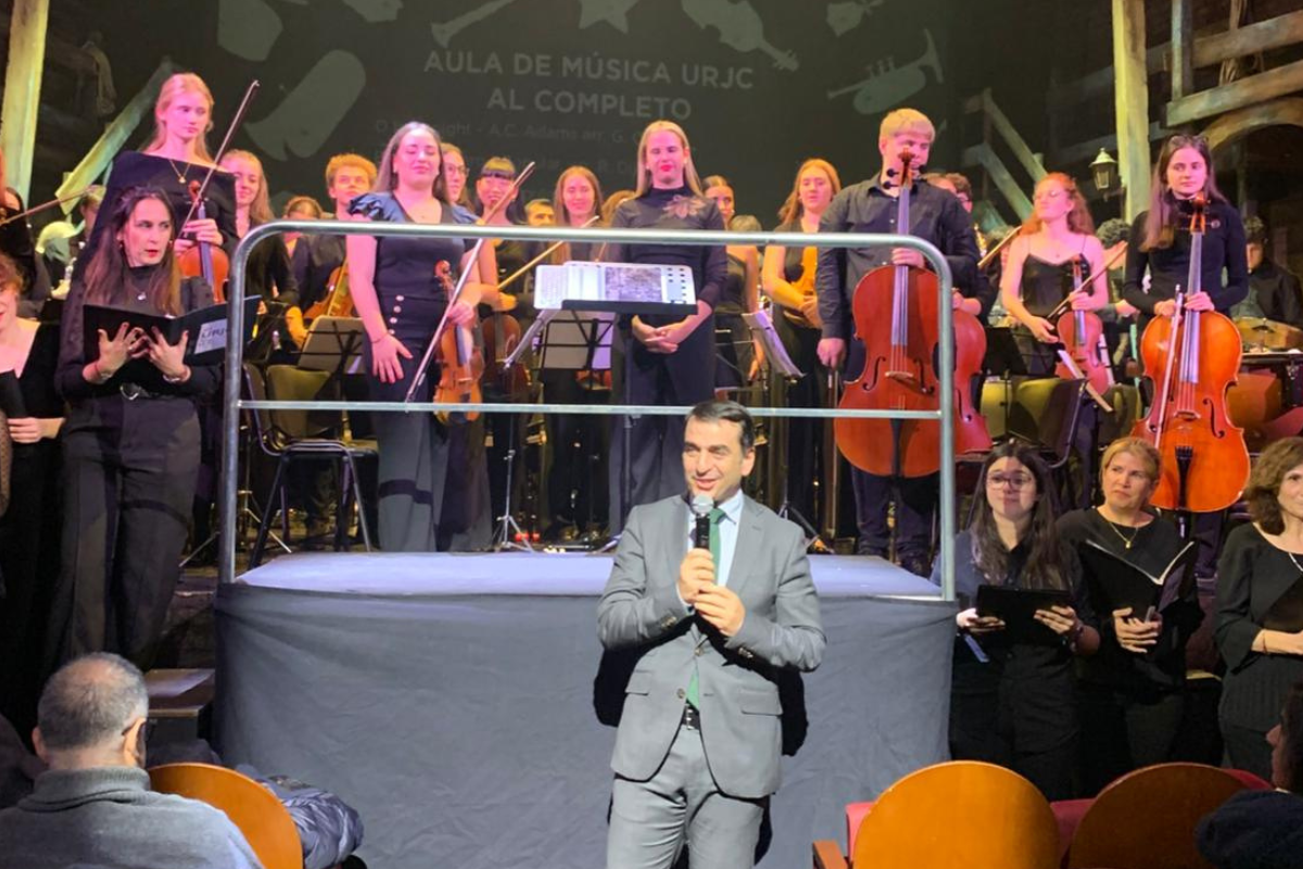 La mallorquina Gemma Camps, directora de coro y orquesta dirigía la batuta de nuevo. El acto comenzó con la actuación del Coro de la URJC interpretando ‘Benedicat Bovis’ de G.F Haendel, seguido de ‘In Stiller nacht’ de J. Brams, ‘Joyful, Joyful’ versión con arreglo de Mervyn Warren, ‘Noche de paz’ de F. Gruber y ‘Themes on falala’ de C. Bridwell.