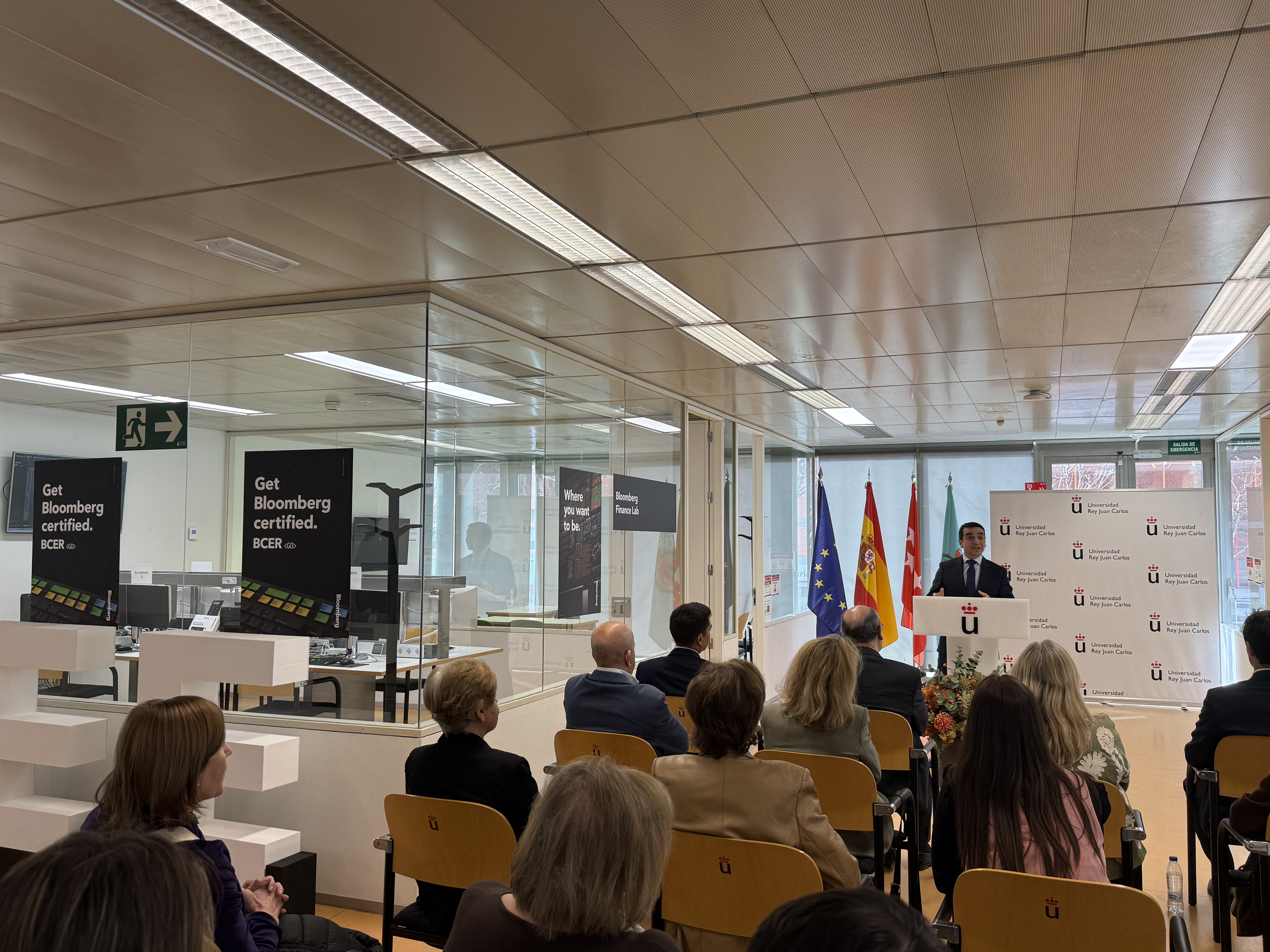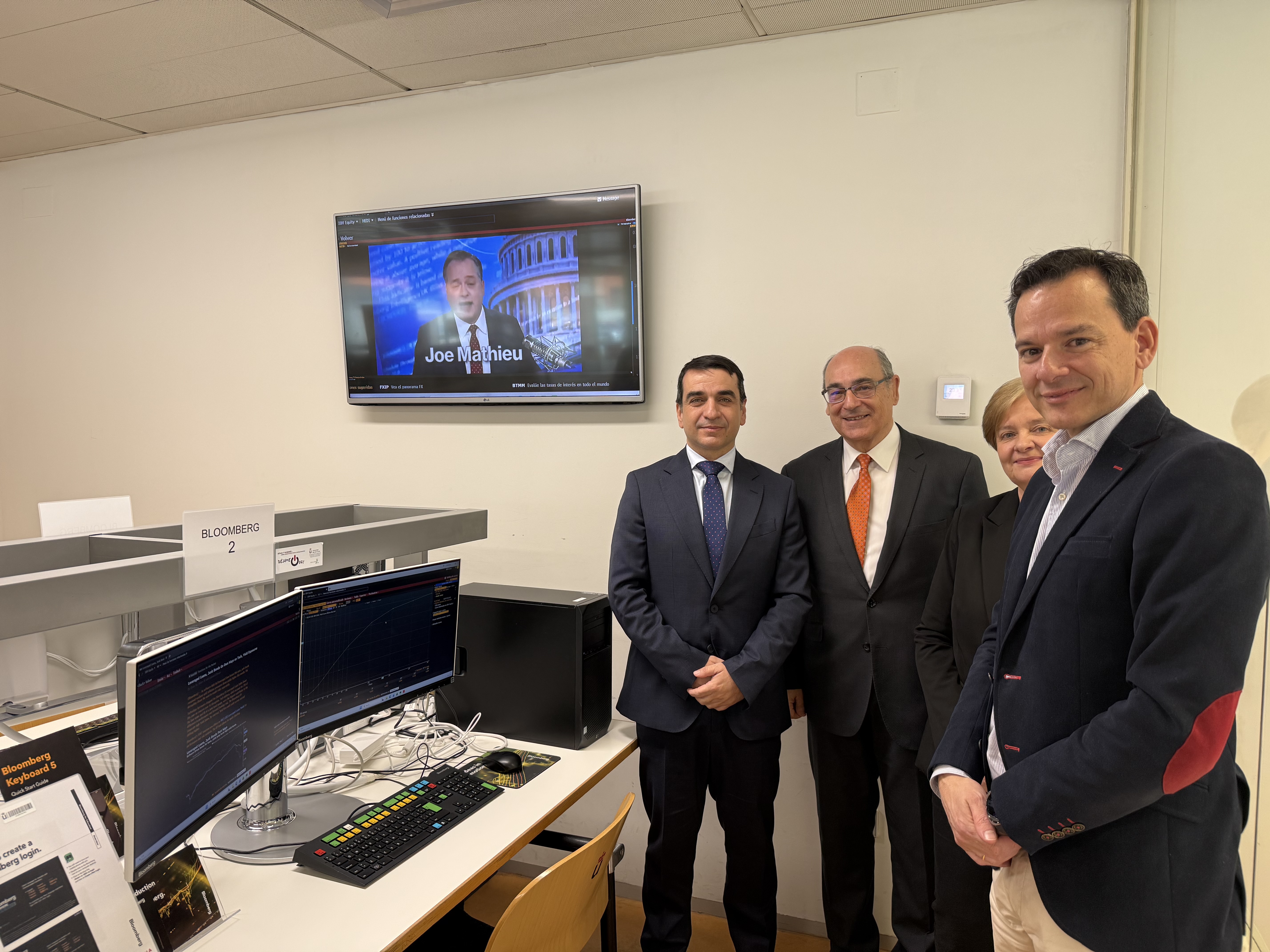 El acto de apertura contó con la presencia de Miguel Cuerdo, decano de la Facultad de Ciencias Económicas y Empresariales, Carlo Renzini, representante de Bloomberg y Abraham Duarte, rector de la URJC, que destacó la relevancia del proyecto para la excelencia académica e investigadora de la universidad.